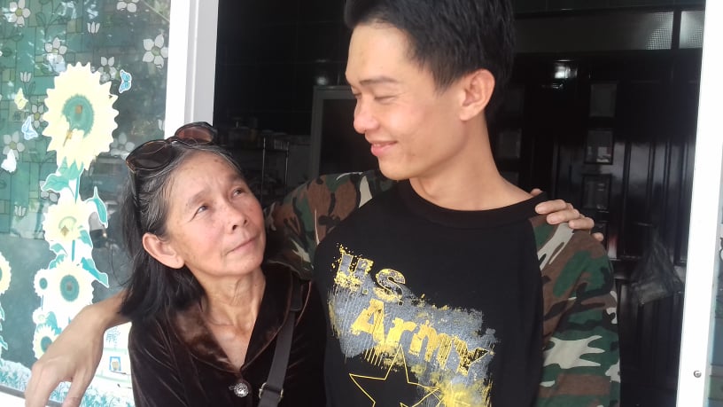 | Tù nhân lương tâm Đinh Nguyên Kha và mẹ trong ngày 11-10-2018. Ảnh: Tâm Don |