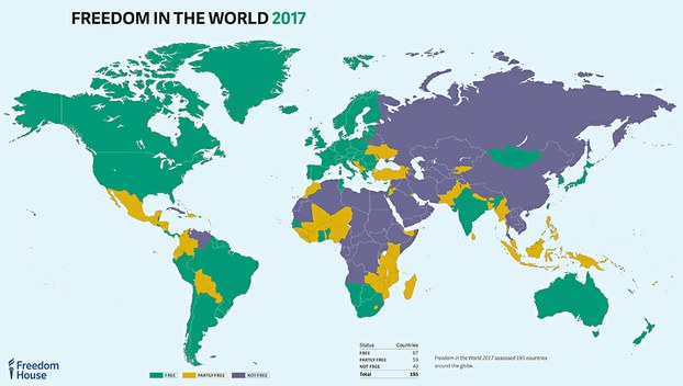 Trong phúc trình về tự do toàn cầu 2017, Freedom House sử dụng sơ đồ màu xanh lá cho những nước thực sự có tự do, màu vàng dành cho những nước phần nào có tự do, màu tím là những nước không có tự do. Năm nay, Việt Nam vẫn nằm trong khung màu tím.
