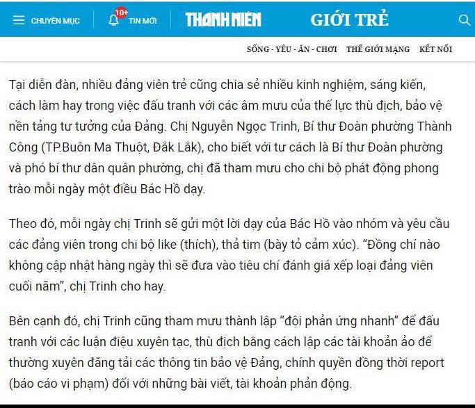 Chị Nguyễn Ngọc Trinh, Bí thư Đoàn phường Thành Công (TP.Buôn Ma Thuột), cho biết với tư cách là Bí thư Đoàn phường và phó bí thư dân quân phường, chị đã tham mưu cho chi bộ phát động phong trào mỗi ngày một điều Bác Hồ dạy. Cũng theo báo Thanh Niên, chị Ngọc Trinh cũng tham mưu thành lập “đội phản ứng nhanh” để đấu tranh với các luận điệu xuyên tạc, thù địch bằng cách lập các tài khoản ảo để thường xuyên đăng tải các thông tin bảo vệ Đảng, chính quyền đồng thời report (báo cáo vi phạm) đối với những bài viết, tài khoản phản động.